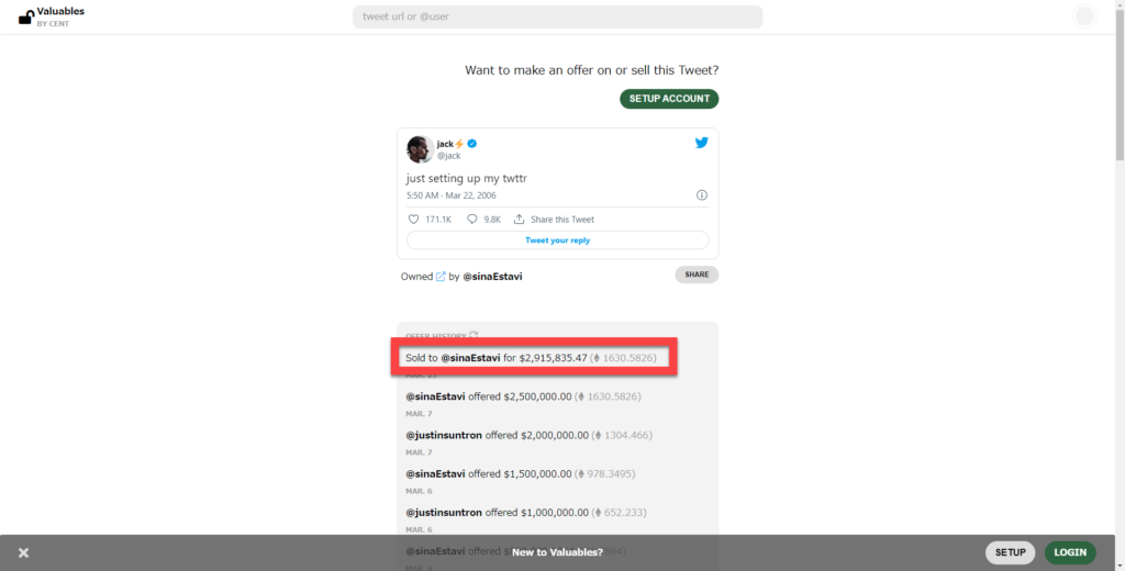 創業者の最初のツイートデータが、
