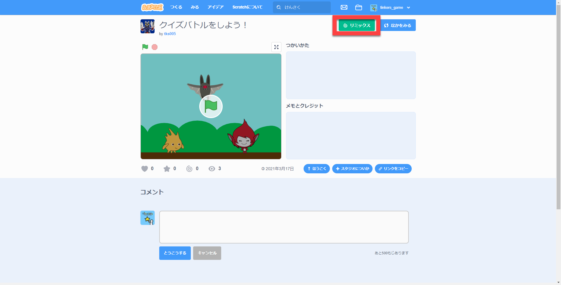 Scratch で作品を共有するときは「メモと作品への貢献」へ