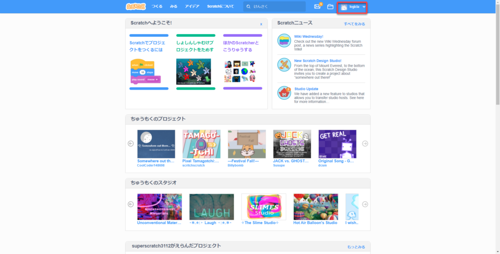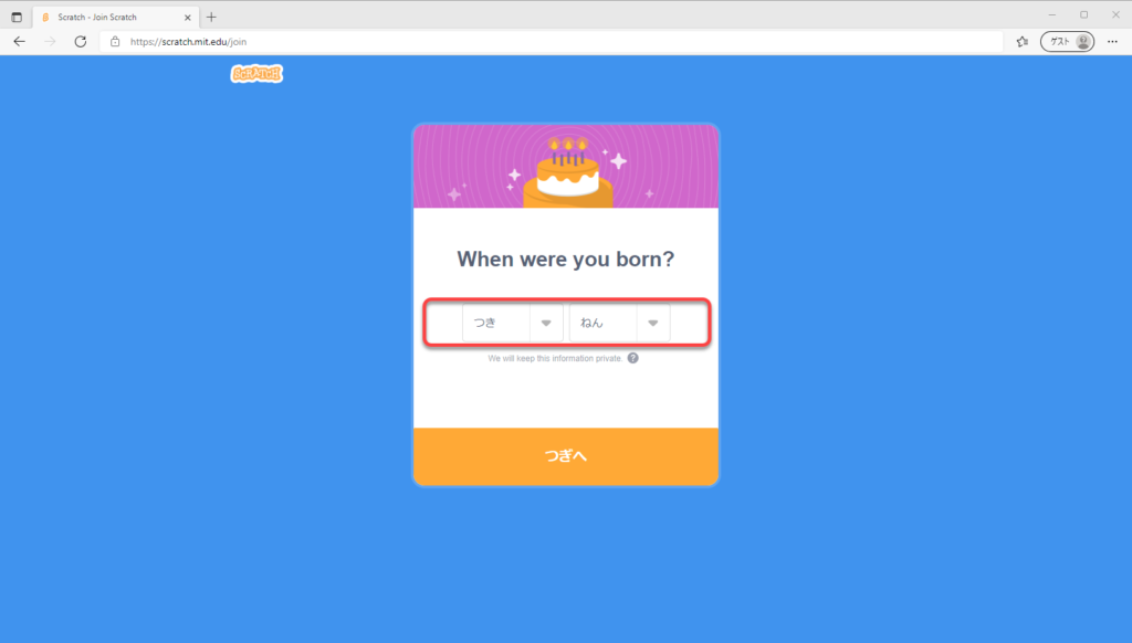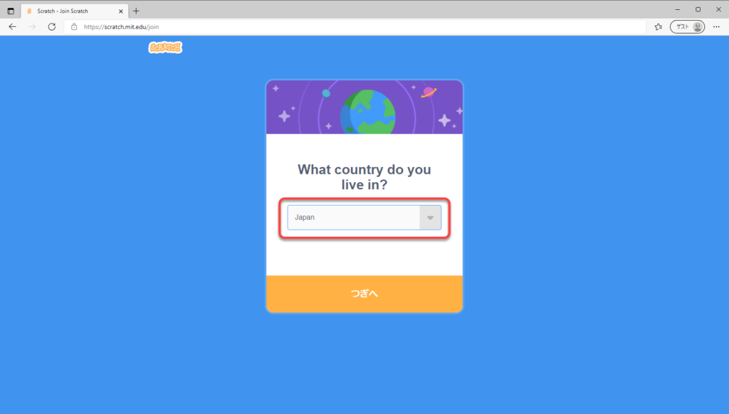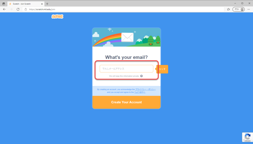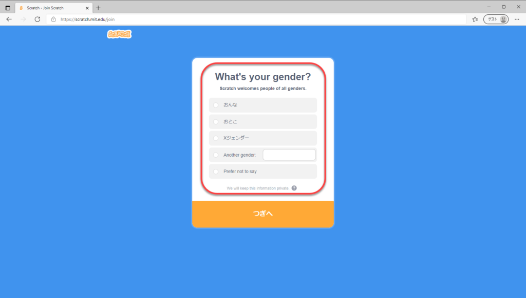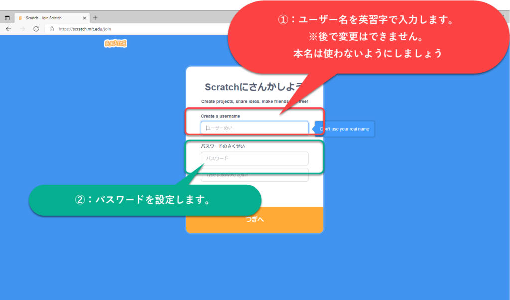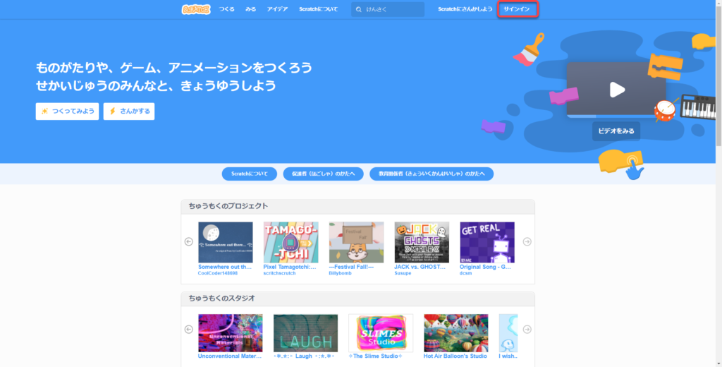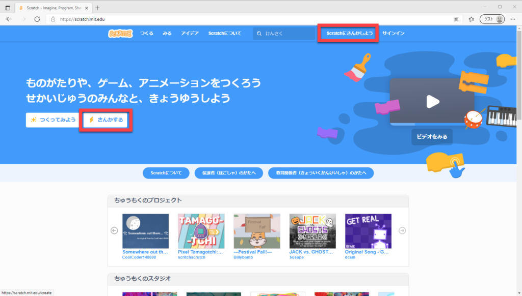 ②赤枠部分「Scratchにさんかしよう」「さんかする」の