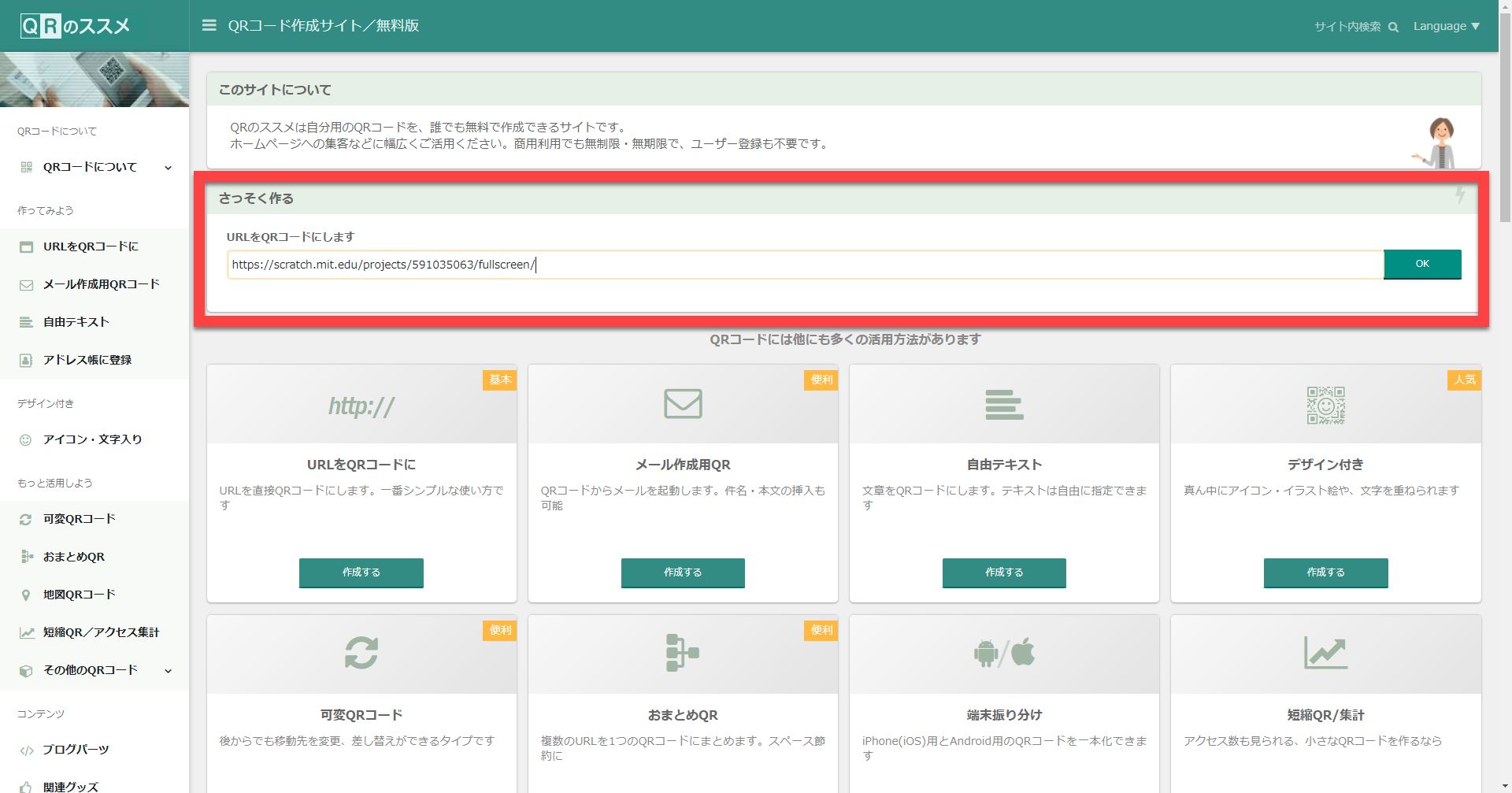 ①QR作成ができるサイトに行きます。