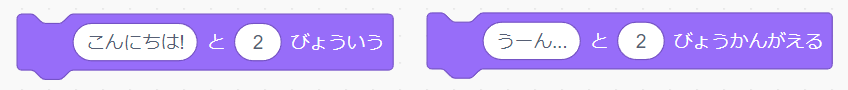 このブロックを使うと、設定した秒数だけセリフを言ってくれる便利なブロックですが、